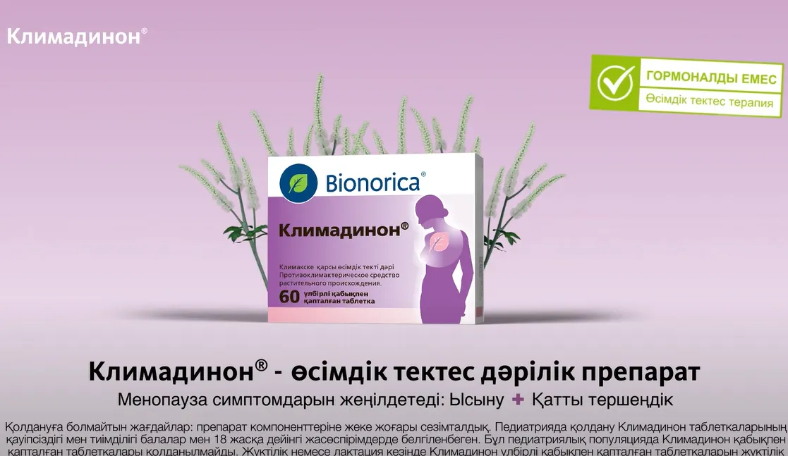 Климадинон® – цимицифуга сығындысы негізіндегі гормоналды емес препарат. Ол менопауза белгілерін жеңілдету үшін гормоналды терапияға қарағанда қауіпсіздеу балама ретінде қарастырылады2.